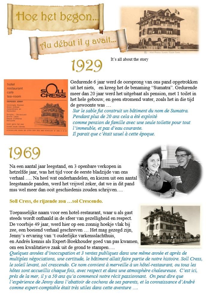 Quelques années d’inoccupation et 3 ventes publiques dans une même année et après de multiples négociations, une certitude, le bâtiment allait faire partie de notre histoire.Soll Cress, le soleil levant, sol crescendo. Ce nom convient à merveille à un hôtel-restaurant, ou tous les hôtes sont accueillis chaque fois, avec respect et dans une atmosphère chaleureuse. C’est ici, près de la mer, il y a 50 ans qu’a commencé notre récit passionnant. On peut dire que l’expérience de Jenny dans l’abattoir de cochons de ses parents, et la connaissance d’André comme expert-comptable était très utiles dans cette aventure ….