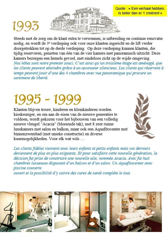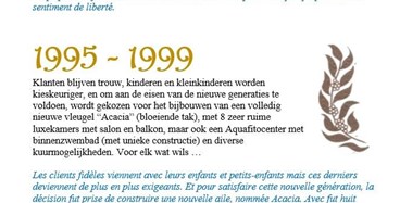 Klanten blijven trouw, kinderen en kleinkinderen worden kieskeuriger, en om aan de eisen van de nieuwe generaties te voldoen, wordt gekozen voor het bijbouwen van een volledig nieuwe vleugel “Acacia” (bloeiende tak), met 8 zeer ruime luxekamers met salon en balkon, maar ook een Aquafitocenter met binnenzwembad (met unieke constructie) en diverse kuurmogelijkheden. Voor elk wat wils …