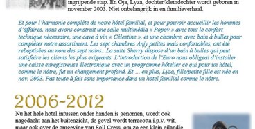Et pour l’harmonie complète de notre hôtel familial, et pour pouvoir accueillir les hommes d’affaires, nous avons construit une salle multimédia « Popov » avec tout le confort technique nécessaire, une cave à vin « Célestine », et une chambre, avec bain à bulles pour compléter notre assortiment. Les sept chambres Anjy petites mais confortables, ont été rebaptisées au nom des sept nains. La suite Sherry dispose d’un bain à bulles qui peut satisfaire les clients les plus exigeants. L’introduction de l’Euro nous obligeai d’installer une caisse enregistreuse électronique avec un programme hôtelier ce qui pour un hôtel, comme le nôtre, fut un changement profond. Et … en plus, Lyza, fille/petite fille est née en nov. 2003. Pas toute à fait sans importance dans un hotel familial comme le nôtre.