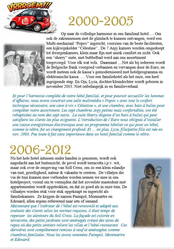 Op naar de volledige harmonie in ons familiaal hotel … Om ook de zakenmensen met de glimlach te kunnen ontvangen, werd een Multi-mediazaal “Popov” ingericht, voorzien van de beste faciliteiten, een kijkwijnkelder “Célestine” . De 7 Anjy kamers worden omgedoopt tot dwergenkamers, klein maar fijn met uniek comfort en zicht. Ook een “sherry” suite, met bubbelbad werd aan ons assortiment toegevoegd. Voor elk wat wils. Daarnaast …Net als bij iedereen wordt de Belgische frank voorgoed verbannen en vervangen door de Euro, en wordt meteen ook de kassa’s gemoderniseerd met hotelprogramma en elektronische kassa …. Voor een familiehotel als het onze, een heel ingrijpende stap. En Oja, Lyza, dochter/kleindochter wordt geboren in november 2003. Niet onbelangrijk in en familieverhaal.