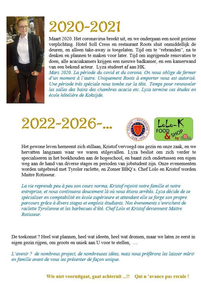 Maart 2020. Het coronavirus breekt uit, en we ondergaan een nooit geziene verplichting. Hotel Soll Cress en restaurant Roots sluit onmiddellijk de deuren, en alleen take-away is toegelaten. Tijd om te “rebranden”, na te denken en plannen te maken voor later. Tijd om ingrijpende renovaties te doen, alle acaciakamers krijgen een nieuwe badkamer, en een kamerwand van een bekend acteur. Lyza studeert af aan HK.