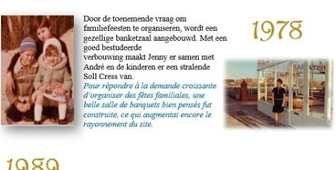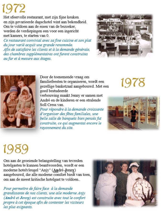 Quelques années d’inoccupation et 3 ventes publiques dans une même année et après de multiples négociations, une certitude, le bâtiment allait faire partie de notre histoire.Soll Cress, le soleil levant, sol crescendo. Ce nom convient à merveille à un hôtel-restaurant, ou tous les hôtes sont accueillis chaque fois, avec respect et dans une atmosphère chaleureuse. C’est ici, près de la mer, il y a 50 ans qu’a commencé notre récit passionnant. On peut dire que l’expérience de Jenny dans l’abattoir de cochons de ses parents, et la connaissance d’André comme expert-comptable était très utiles dans cette aventure ….
