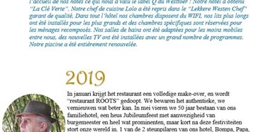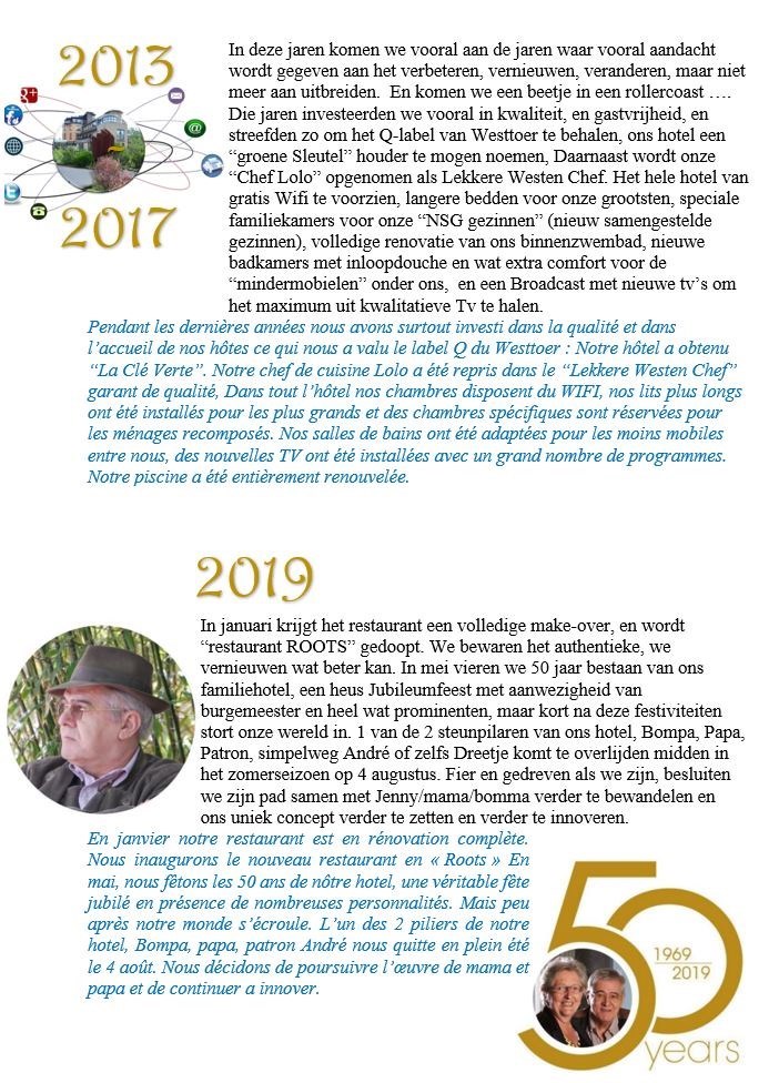 In januari krijgt het restaurant een volledige make-over, en wordt “restaurant ROOTS” gedoopt. We bewaren het authentieke, we vernieuwen wat beter kan. In mei vieren we 50 jaar bestaan van ons familiehotel, een heus Jubileumfeest met aanwezigheid van burgemeester en heel wat prominenten, maar kort na deze festiviteiten stort onze wereld in. 1 van de 2 steunpilaren van ons hotel, Bompa, Papa, Patron, simpelweg André of zelfs Dreetje komt te overlijden midden in het zomerseizoen op 4 augustus. Fier en gedreven als we zijn, besluiten we zijn pad samen met Jenny/mama/bomma verder te bewandelen en ons uniek concept verder te zetten en verder te innoveren.